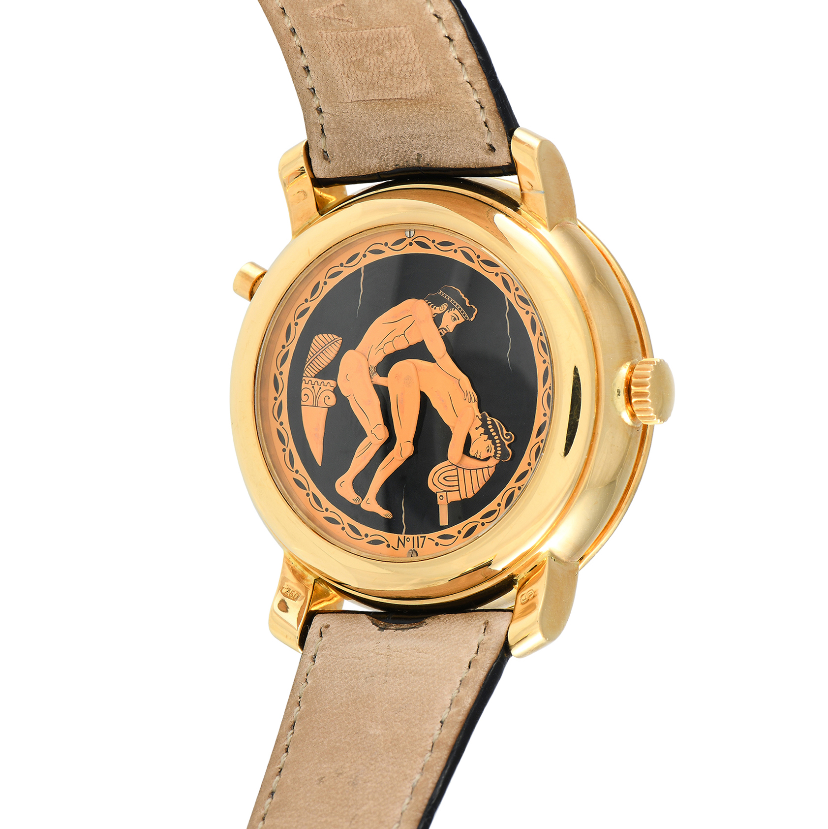 In the genre of erotic timepieces, the work of master watchmaker Svend Andersen stands out. This Eros XL Repeater has a classic front dial in blue detailed with skeletonized hands, sparkling hour markers and elegant Roman numeral 3-6-9-12 markers. The dial’s reverse side reveals an erotic automaton that works with the pusher at 8 o’clock. The watch has a 42mm case in 18K yellow gold, worn on a leather strap with an Andersen-signed yellow gold tang buckle. This hand-wound timepiece with a time-only function has a 30m water resistance.