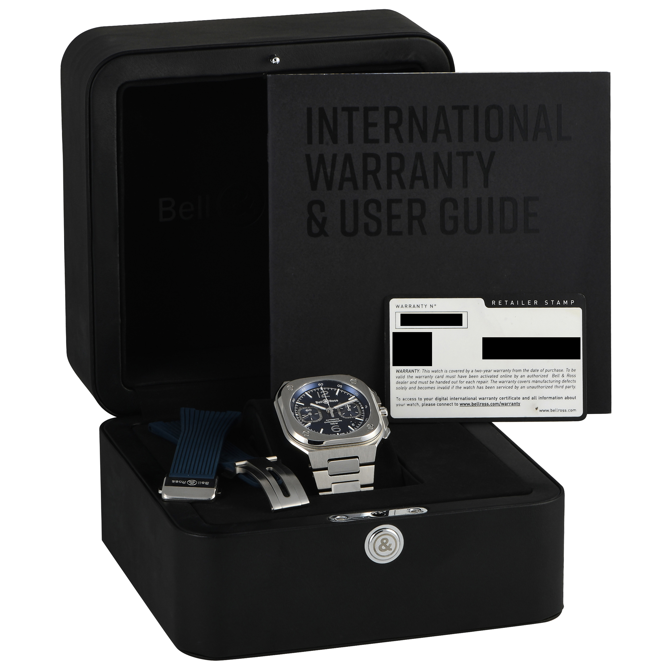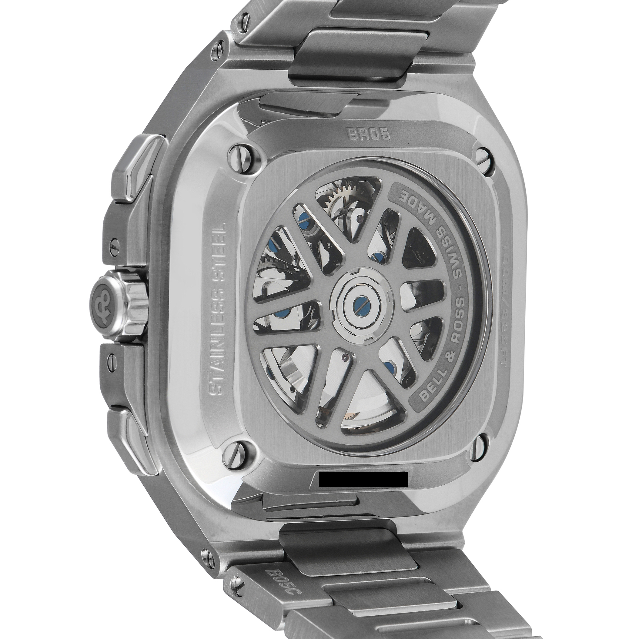 This is a pre-owned Bell & Ross BR05 Chrono Blue Steel Watch BR05C-BU-ST/SST. It comes with the manufacturer’s box, papers, and extra straps.