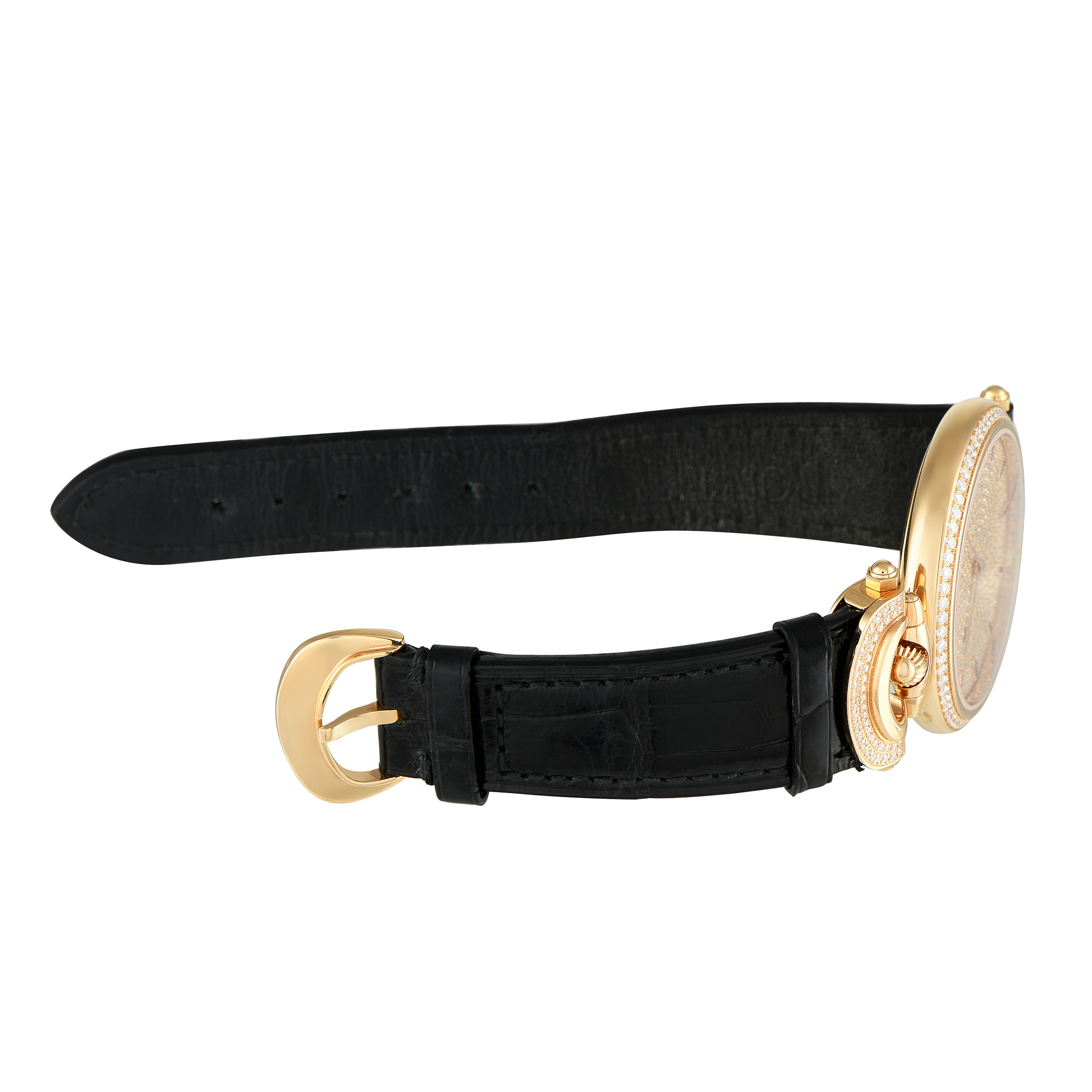 A stunning BOVET creation that illustrates how the brilliance of fine jewelry enriches every detail of watchmaking. This time-only watch has a lavish case done in 18K rose gold, with the bezel pavé-set with diamonds. The dial itself is entirely diamond-set, with 12 ruby hour markers, and a pair of rose gold serpentine-shaped hands. The diamond-studded bow around the crown at 12 o’clock is a signature BOVET touch, echoing the brand’s 19th-century pocket watches.