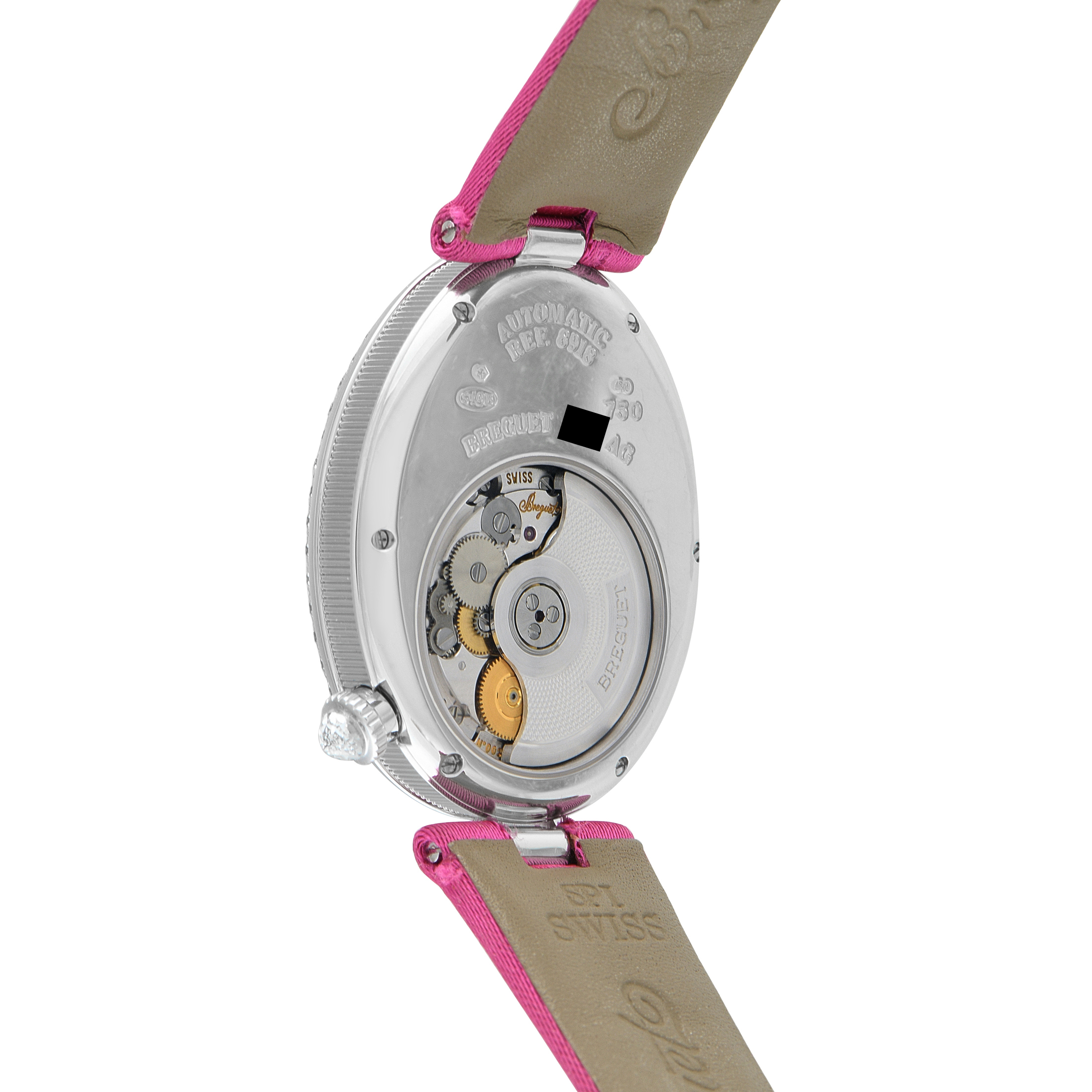 This is a pre-owned Breguet Reine de Naples White Gold Pink Strap Ladies Watch 8918, and it comes with a gift box.