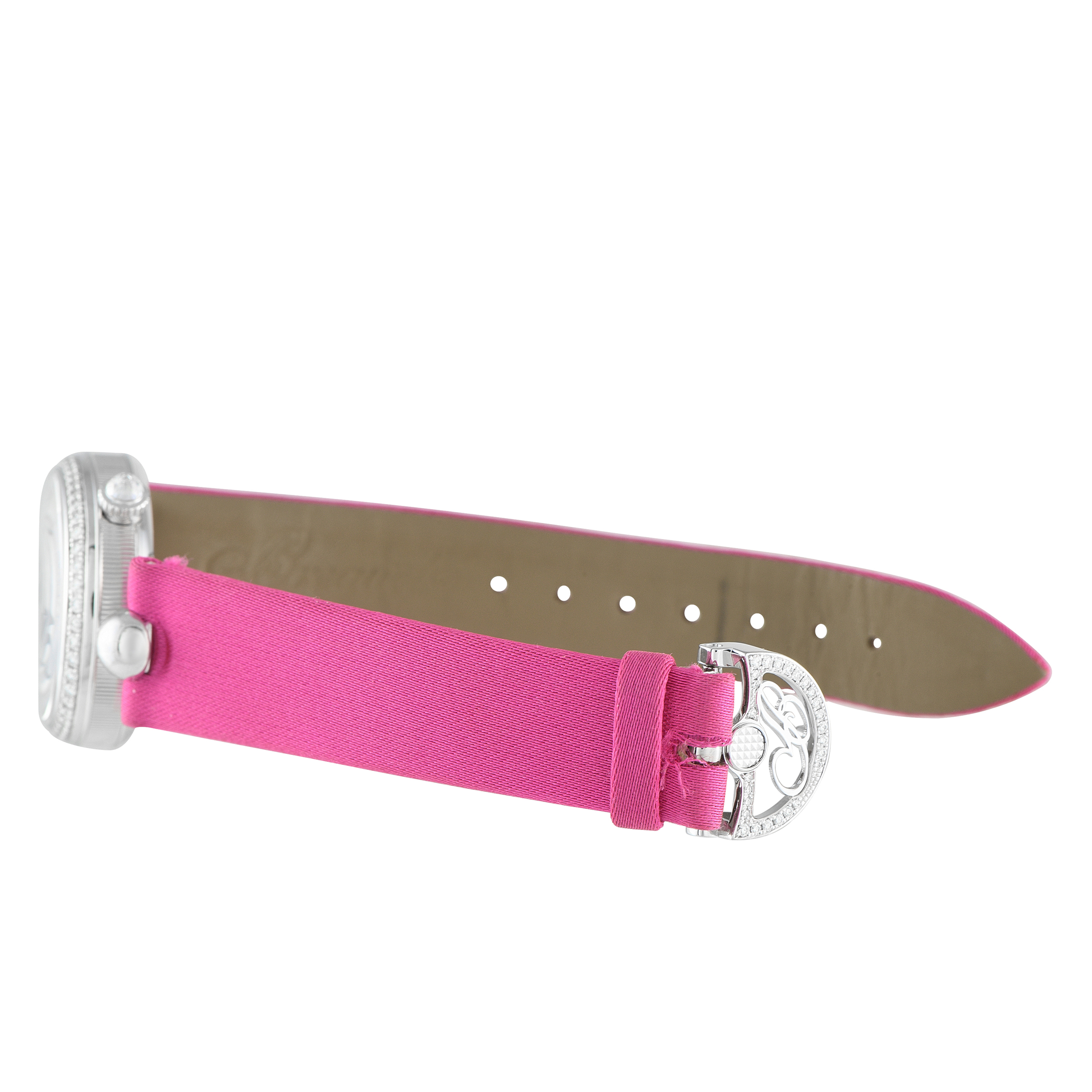 The Reine de Naples ref. 891 expresses Breguet’s craft through feminine grace and timeless sophistication. This watch features a 29 x 36.5 mm oval case in 18K white gold, framed by a diamond-set bezel and Breguet’s signature reeded caseband. Its mother-of-pearl dial houses a pair of blued steel Breguet hands on an off-centered guilloché ring surrounded by a stylized layout of Arabic numeral hour markers. The pear-shaped diamond positioned at 6 o’clock and the diamond-set crown at 4 o’clock add a distinctive charm to the watch. Visible from the transparent case back is the precise and finely finished caliber 537/1 automatic movement with 20 jewels and 40 hours of power reserve. A pink fabric strap with leather backing completes the look of this luxurious timepiece.