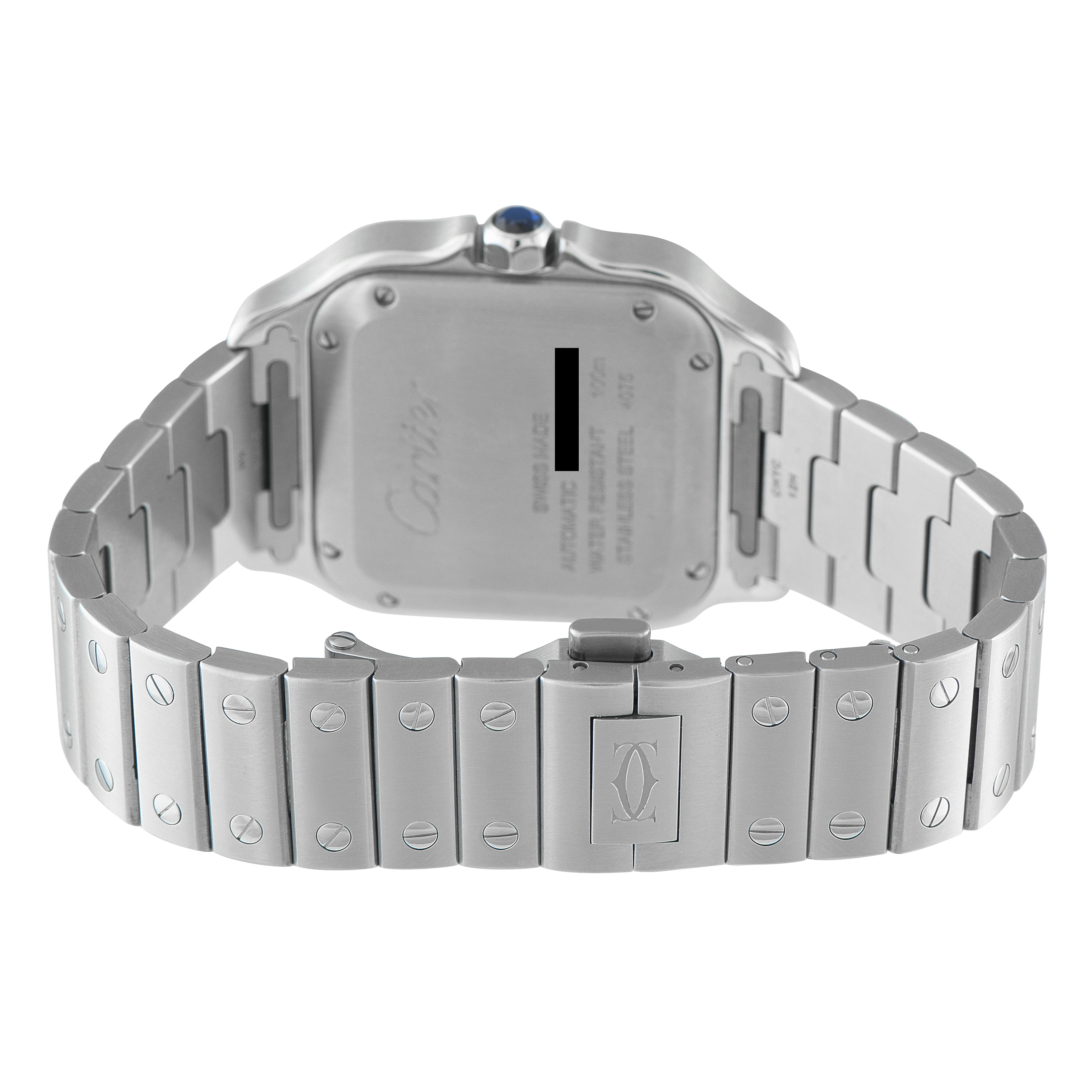 This pre-owned Cartier Santos de Cartier Silvered Opaline Dial Watch WSSA0010 comes with a gift box.