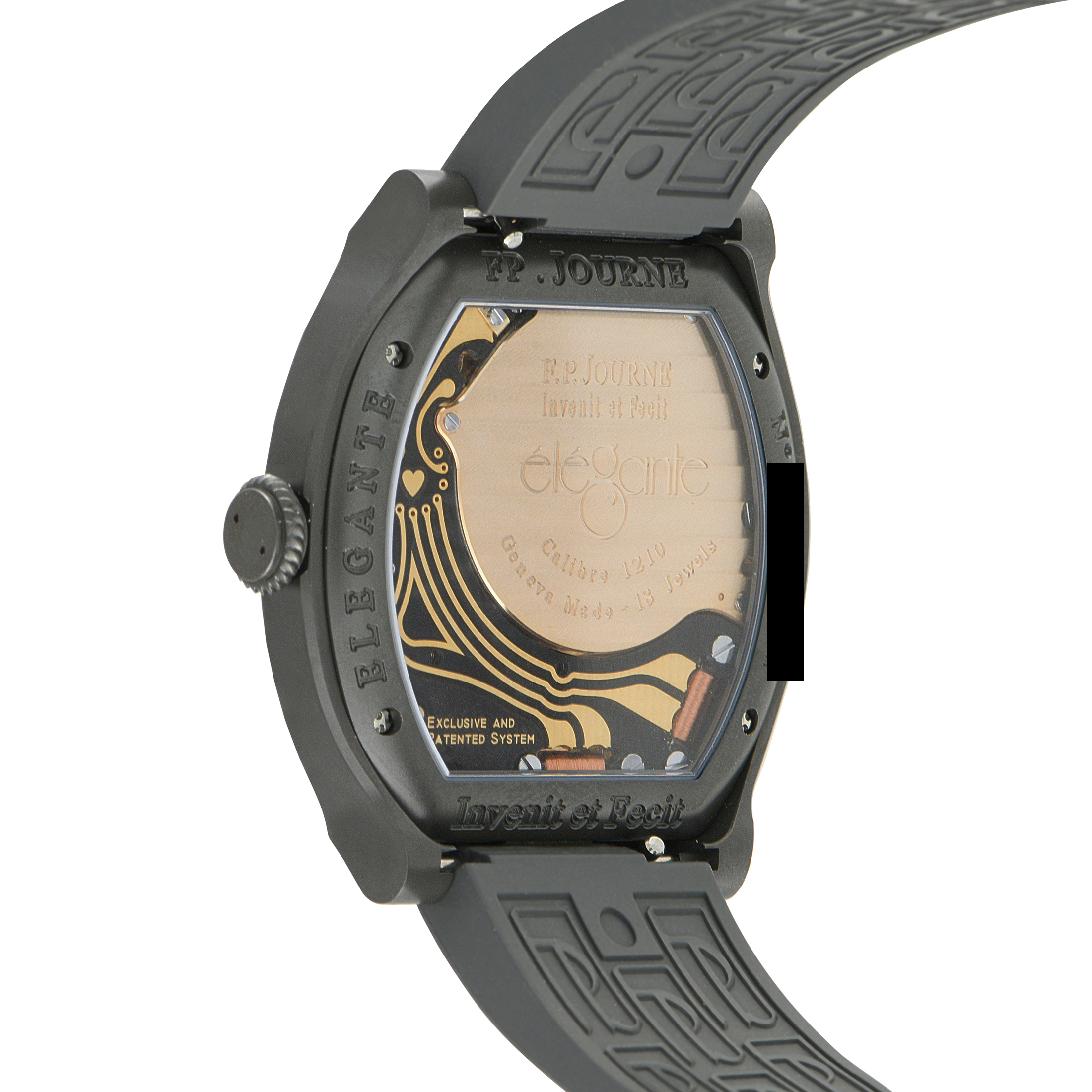 An oversized timepiece showcasing F.P. Journe’s trademarked Flat Tortue case in lightweight titanium. This Elegante watch also features brilliant-cut diamonds set on its bezel, complementing the black luminescent dial with central hour and minute hands and a small seconds sub-dial at 6 o’clock. Truly elegant, this time-only wristwatch balances simplicity with a touch of luxury. The F.P. Journe Elegante is powered by Caliber 1210, an 18-jewel quartz movement, and is fitted with a rubber strap.