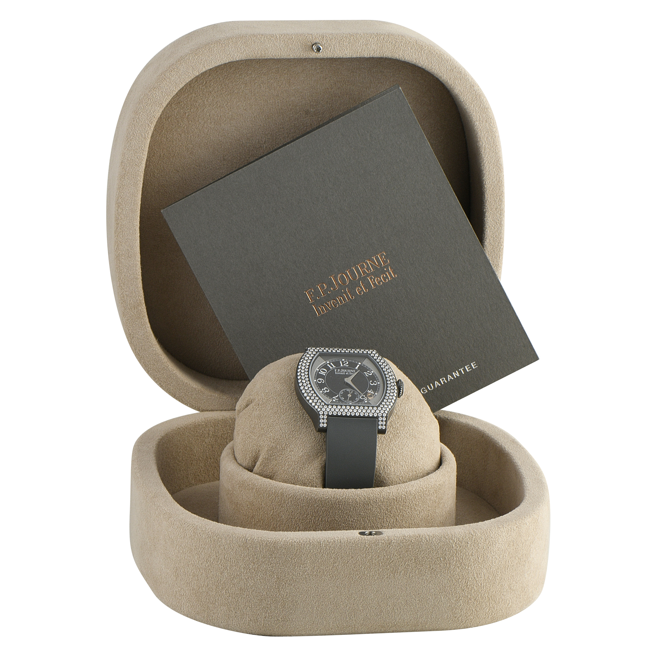 This is a pre-owned F.P. Journe Elegante Diamond Bezel Titanium Watch B-329-BLT. It is accompanied by papers and the manufacturer’s box.