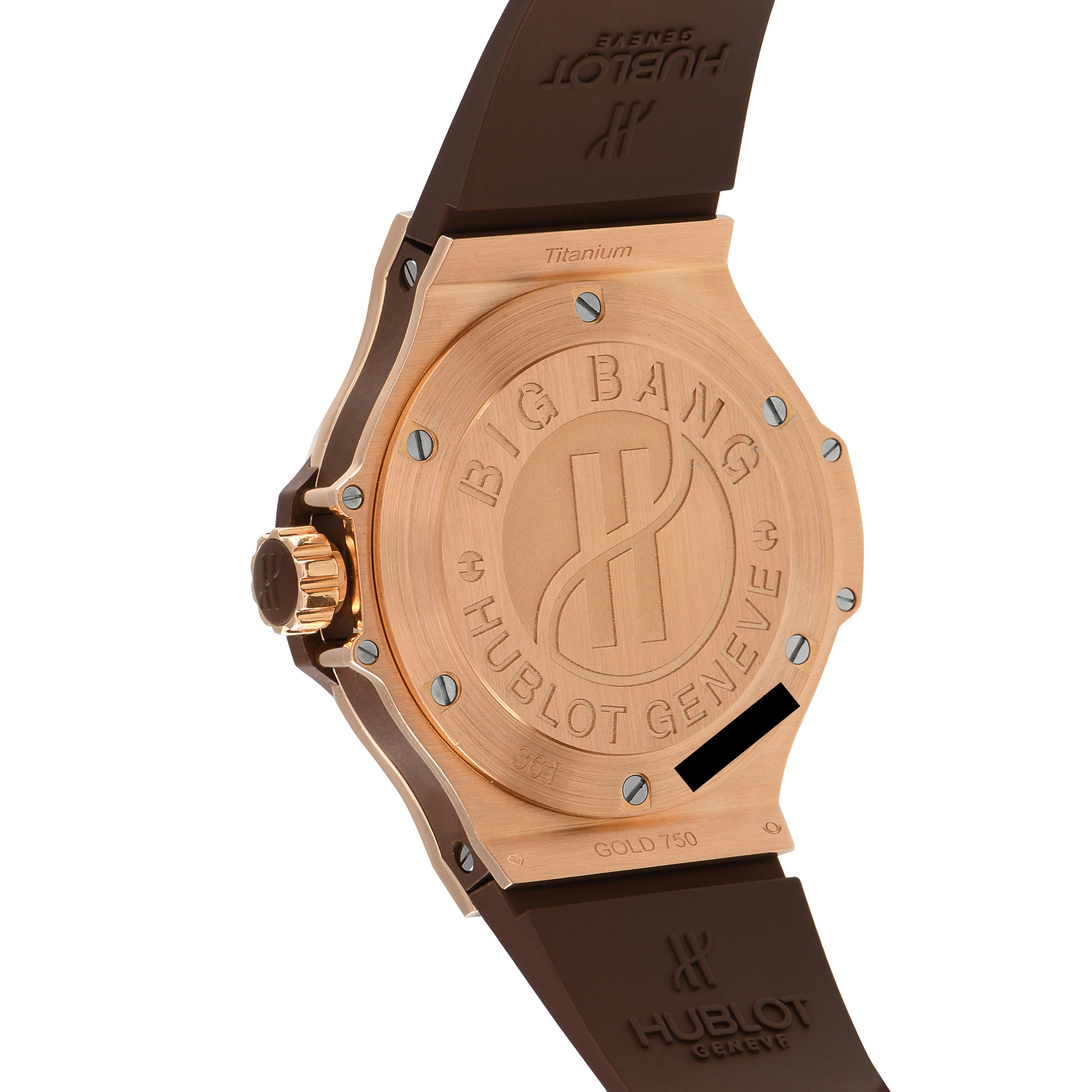 This pre-owned Hublot Big Bang 38 Cappuccino Diamond Bezel Rose Gold Watch 361.PC.3380.RC.1104 comes with a gift box.