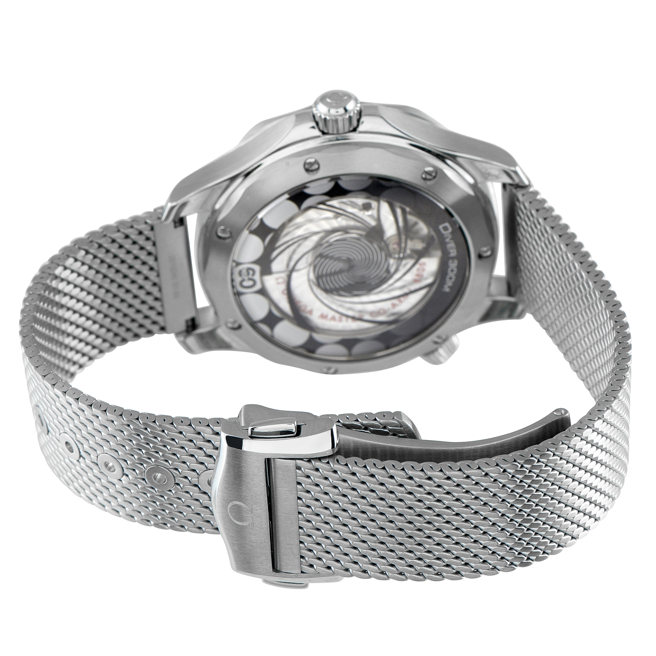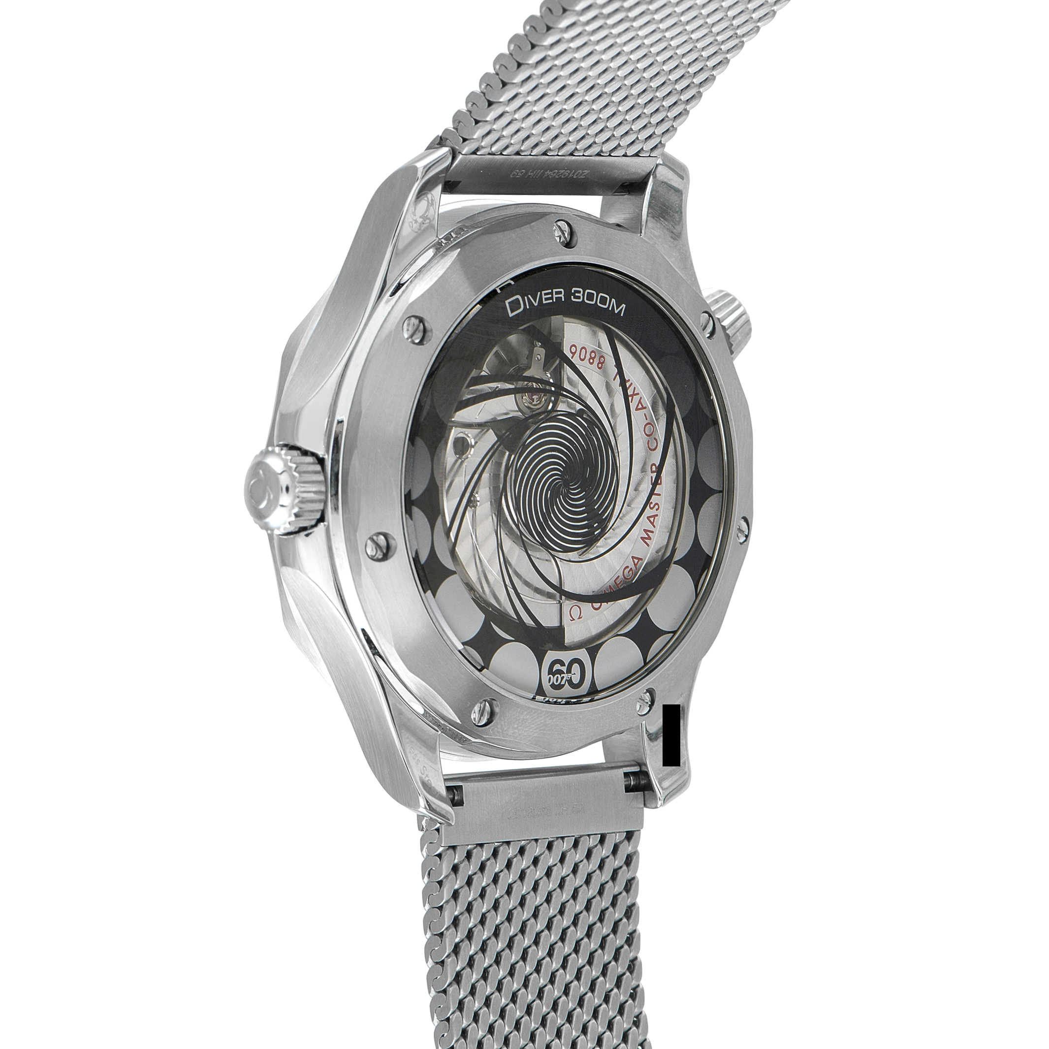 Omega Seamaster Diver 300M ref. 210.30.42.20.03.002 was introduced in 2022 to mark six decades of James Bond. This 60th Anniversary Watch features a 42mm stainless steel case framing a blue anodized aluminum dial with a laser-engraved wave pattern. At its bezel, the traditional inverted triangle gives way to a commemorative “60” mark. A remarkable animation can be seen on the sapphire case back, featuring Bond’s silhouette and the iconic gun-barrel sequence. Completing the design is a mesh-style bracelet in brushed steel, inspired by the modern Seamaster No Time to Die. This model is driven by the Co-Axial Master Chronometer Caliber 8806, which delivers a 55-hour power reserve.