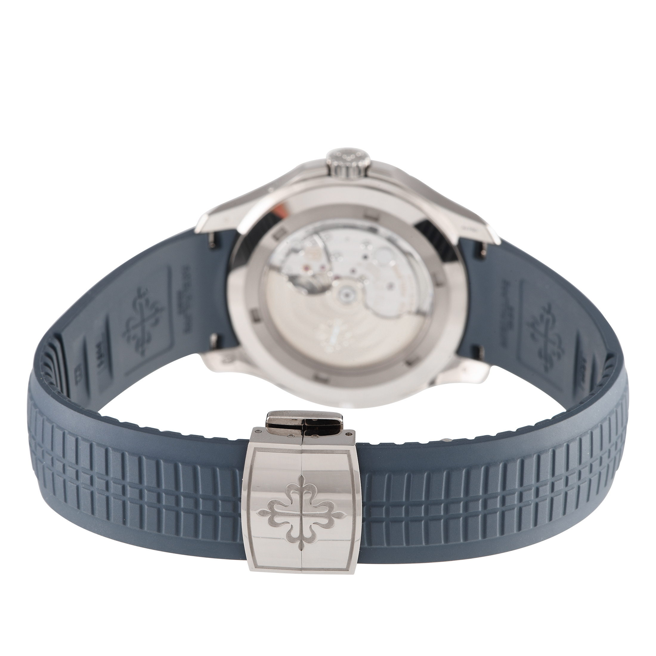 The 18k white gold case measures 40.8mm in diameter and 10.2mm in thickness, featuring the hallmark rounded octagonal bezel with polished and satin-brushed finishes. The denim-like blue-gray embossed dial showcases the Aquanaut pattern, punctuated with gold-applied numerals and luminescent hands for optimal readability.