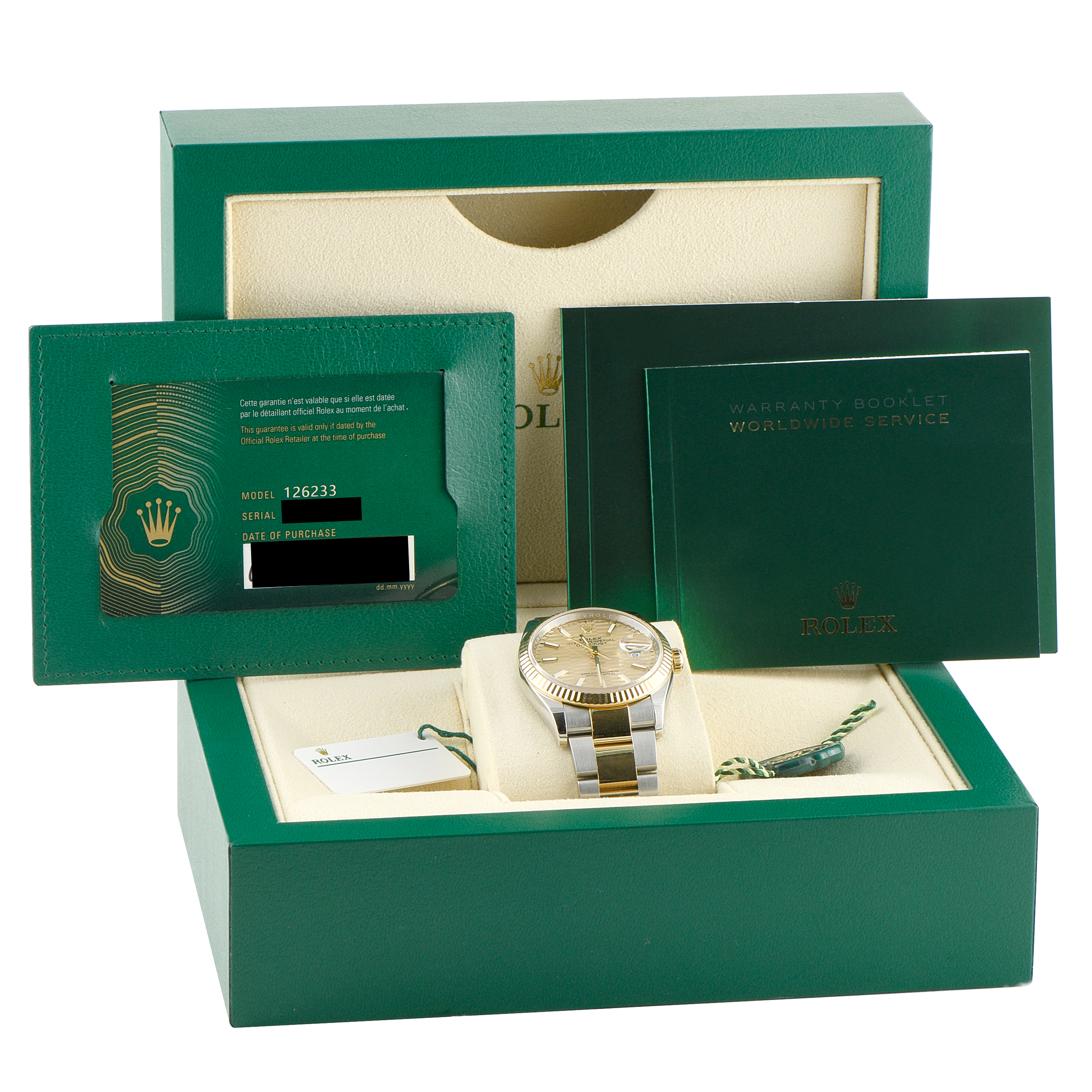 Offered pre-owned, this Rolex Datejust 36 Fluted Dial Two Tone Watch 126233 is accompanied by papers and the manufacturer’s box.