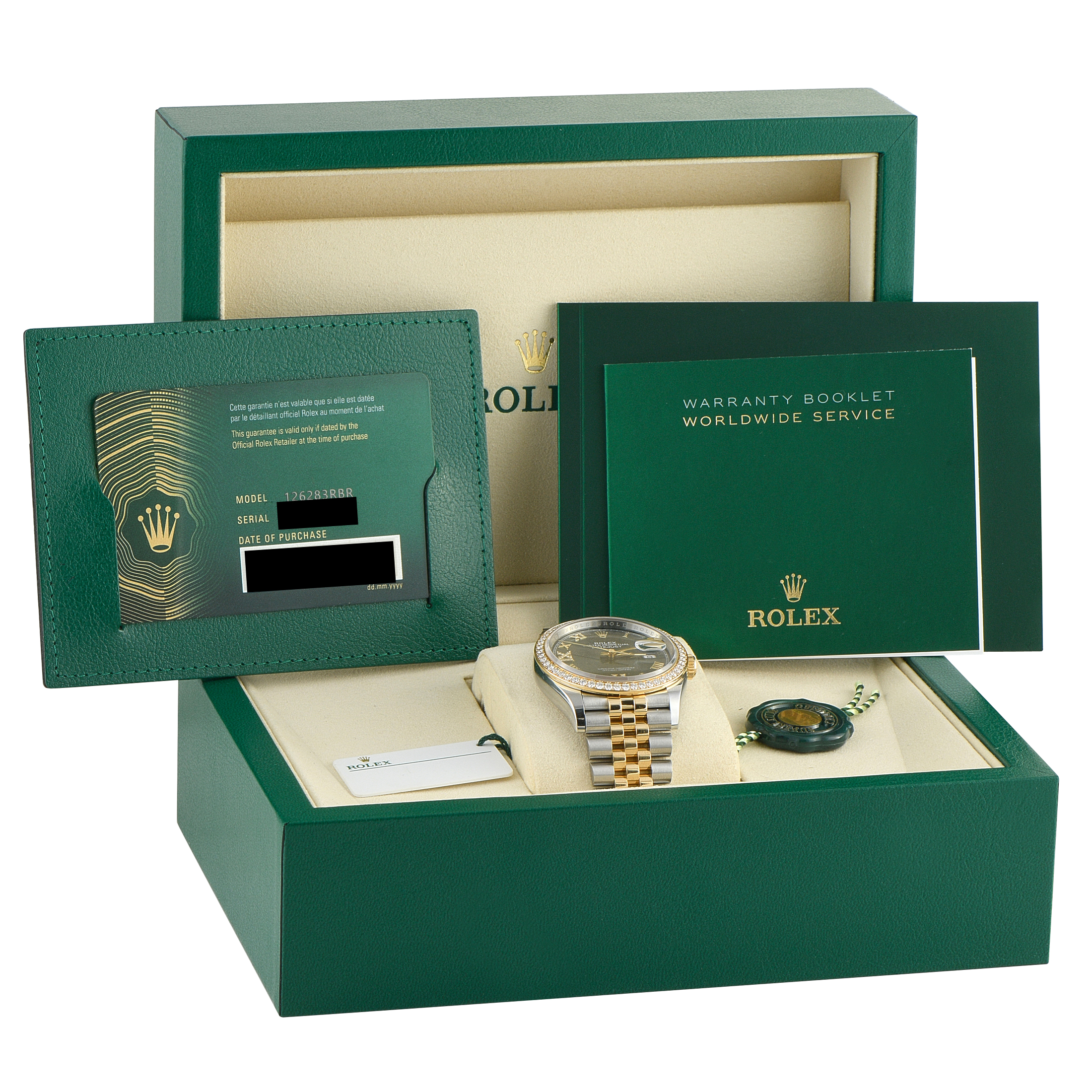 At 36 mm, this Rolex Datejust ref. 126283RBR-0011 offers a versatile presence that suits both men’s and women’s wrists with equal ease. The watch is designed in yellow Rolesor, featuring a compact Oystersteel case framed by a diamond-set yellow gold bezel. The crown and the Jubilee bracelet’s center links are also in yellow gold. An olive green dial anchors the design, with its Roman numeral six and nine accented with more diamonds for a striking sparkle. Beating inside is caliber 3235 automatic movement, delivering Rolex’s hallmark precision and a long 70-hour power reserve.