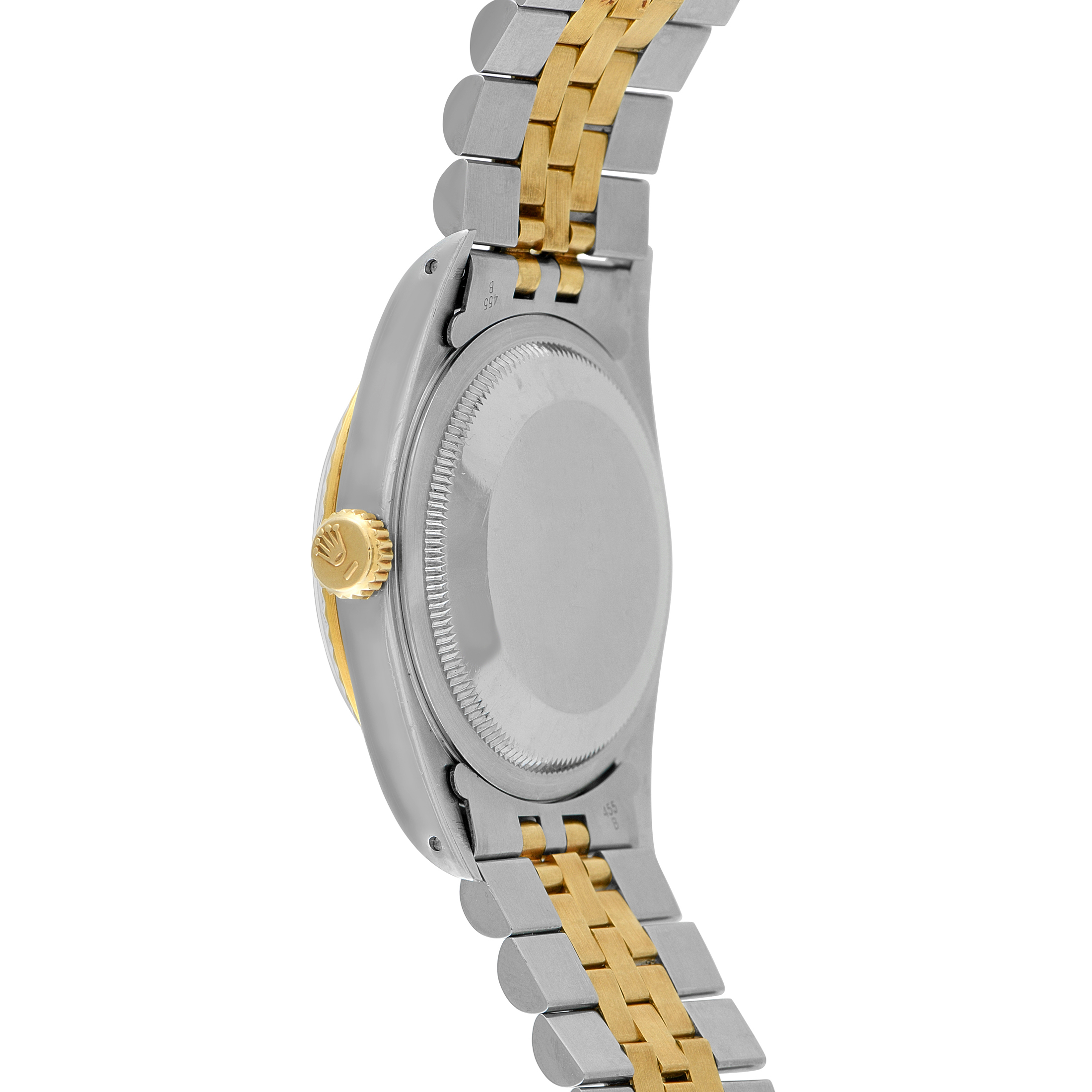 A smart and stylish choice for first-time buyers and collectors seeking a vintage Rolex with modern performance. The Datejust 36 ref. 16233 was introduced in 1988 and remained in production through the early 2000s. It runs on caliber 3135 automatic movement, known for its accuracy and reliability. This model features a two-tone construction, with the 36mm Oyster case, lugs, and the bracelet’s outer links in steel. The fluted bezel, crown, and the bracelet’s inner links are in 18K yellow gold, matching the champagne dial with gold-toned hands and index hour markers. A Cyclops lens magnifies the date at 3 o’clock, enhancing readability.