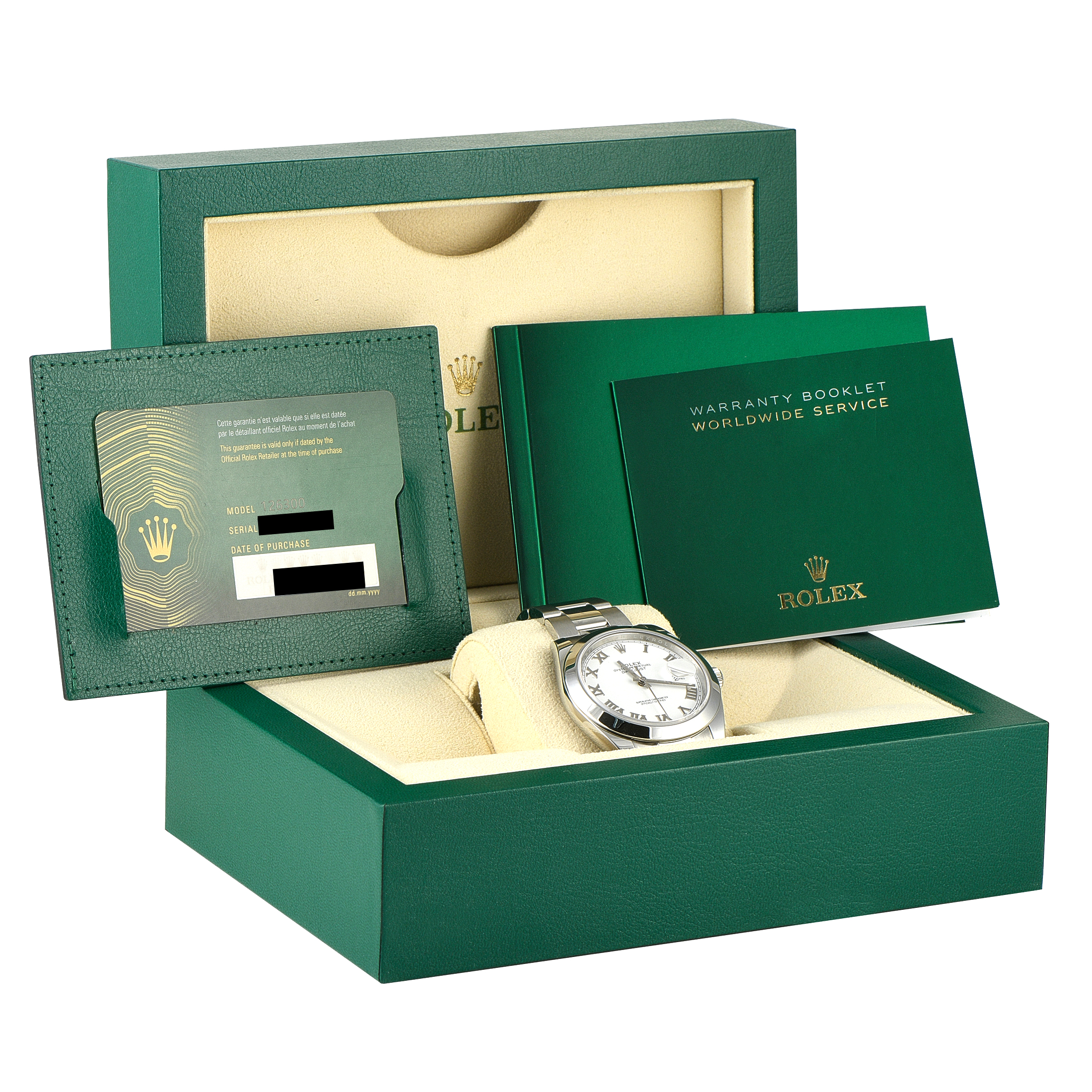 This is a pre-owned Rolex Datejust 41 Roman White Dial Oystersteel Watch 126300. It is accompanied by papers and the manufacturer’s box.