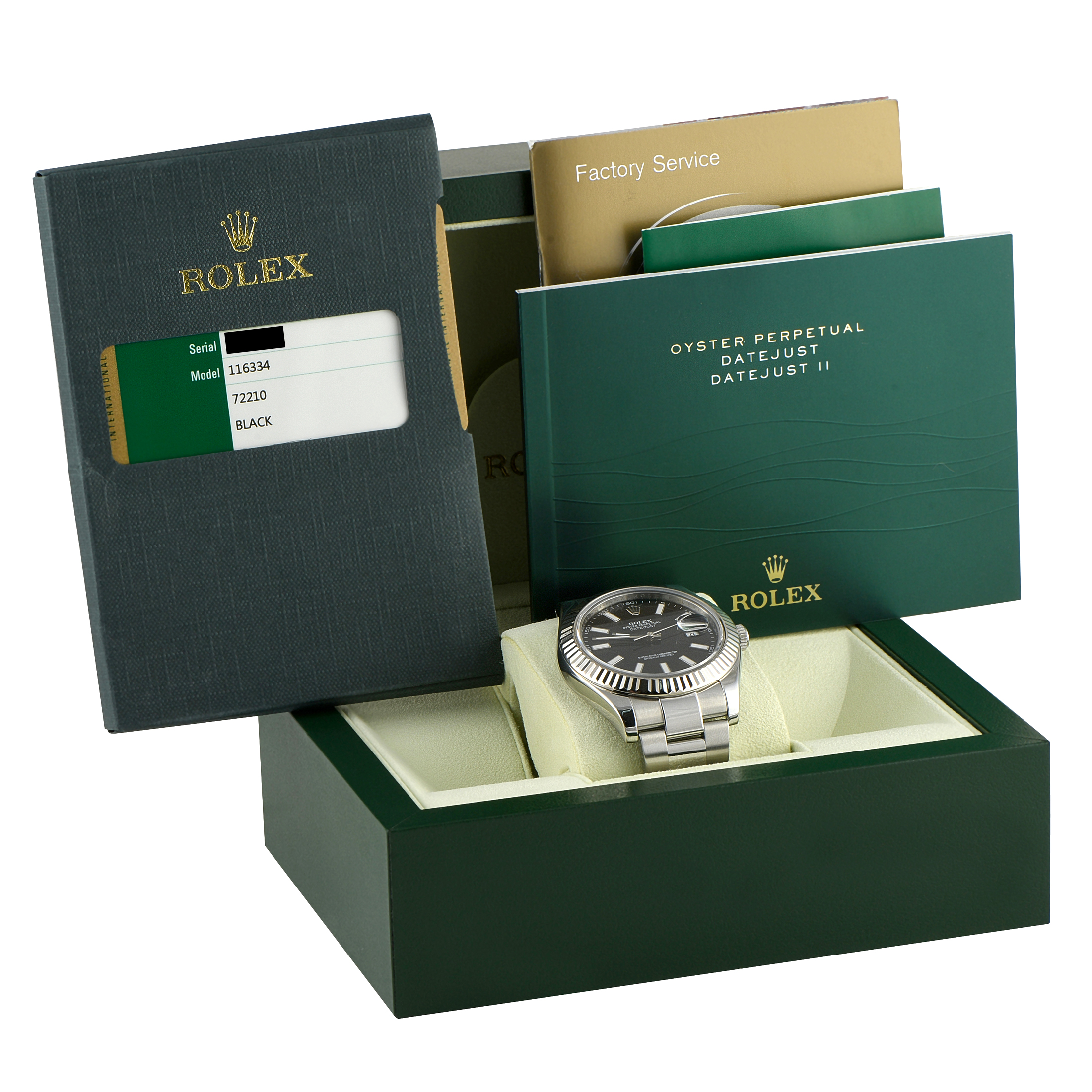 This is a pre-owned Rolex Datejust II Black Dial Watch 116334. It comes complete with papers and the manufacturer’s box.