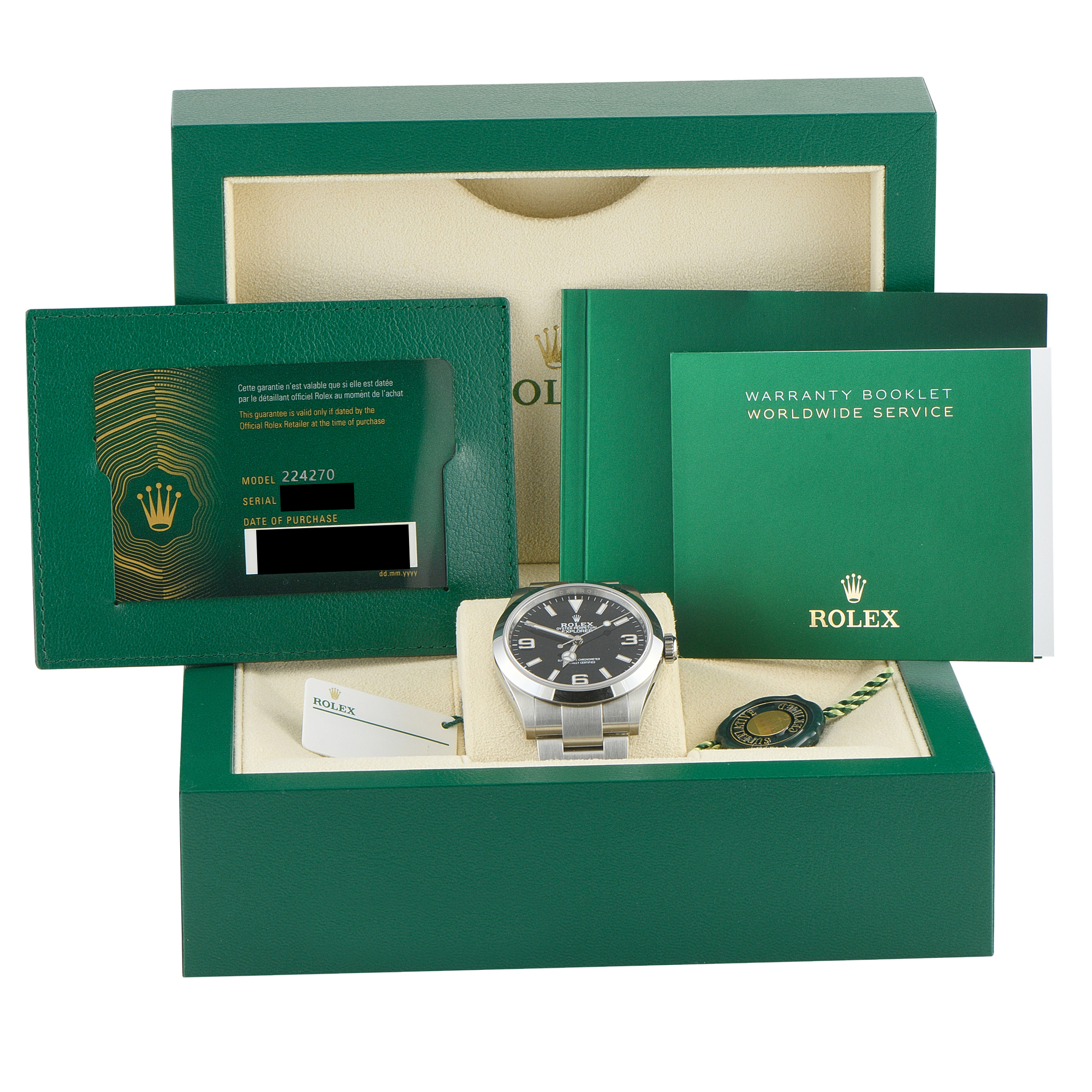 Built for exploration yet refined enough for everyday wear, the Explorer 40 ref. 224270 continues the legacy of one of Rolex’s most enduring icons. Introduced in 2023, this larger 40mm Oystersteel variation features the Explorer’s clean design and rugged profile in a size that appeals to modern tastes. It has a black lacquer dial displaying the signature 3-8-9 numerals alongside lume-filled markers and hands for exceptional visibility. A smooth bezel frames the face, highlighting the Explorer’s classic simplicity. Inside is caliber 3230 automatic movement that delivers a 70-hour power reserve.