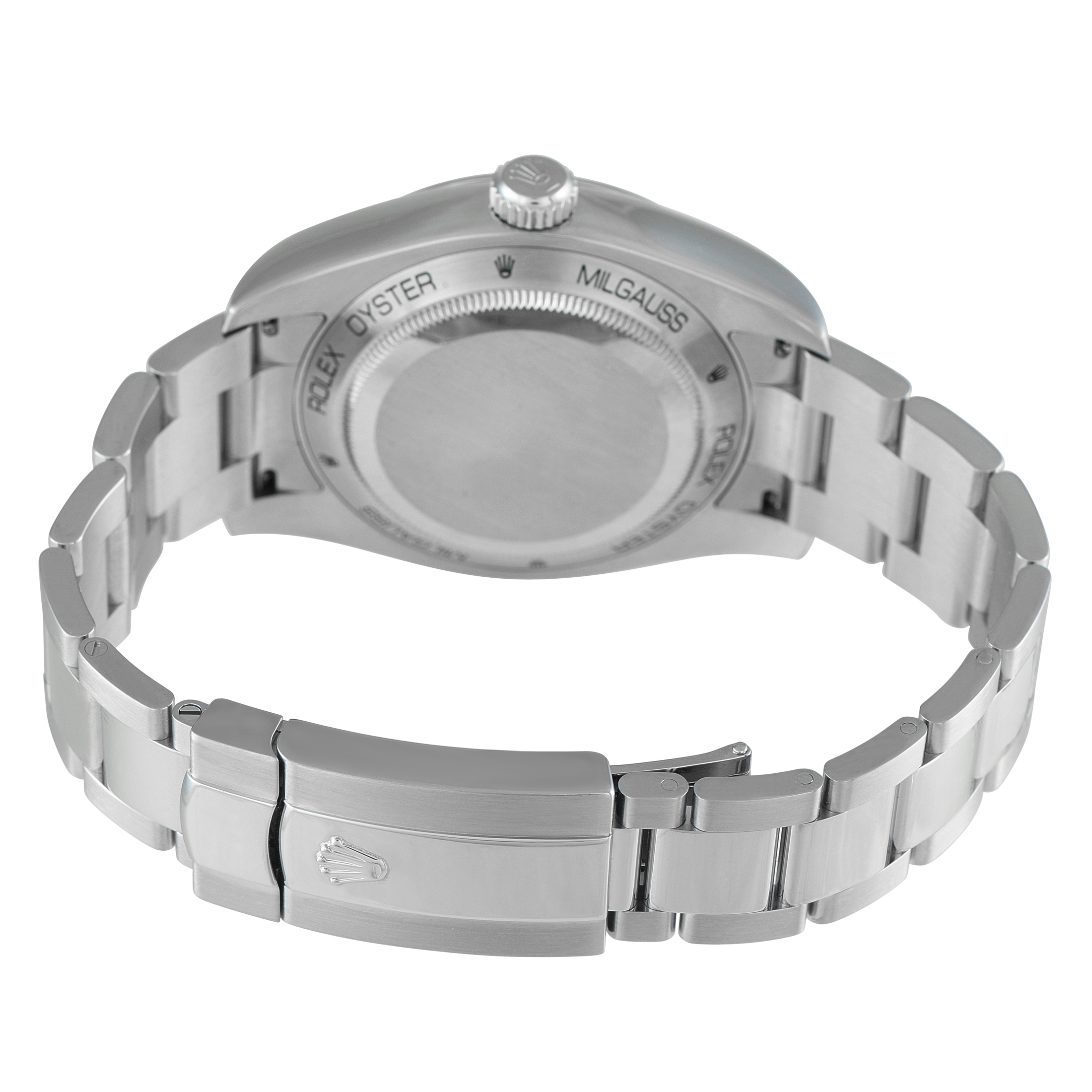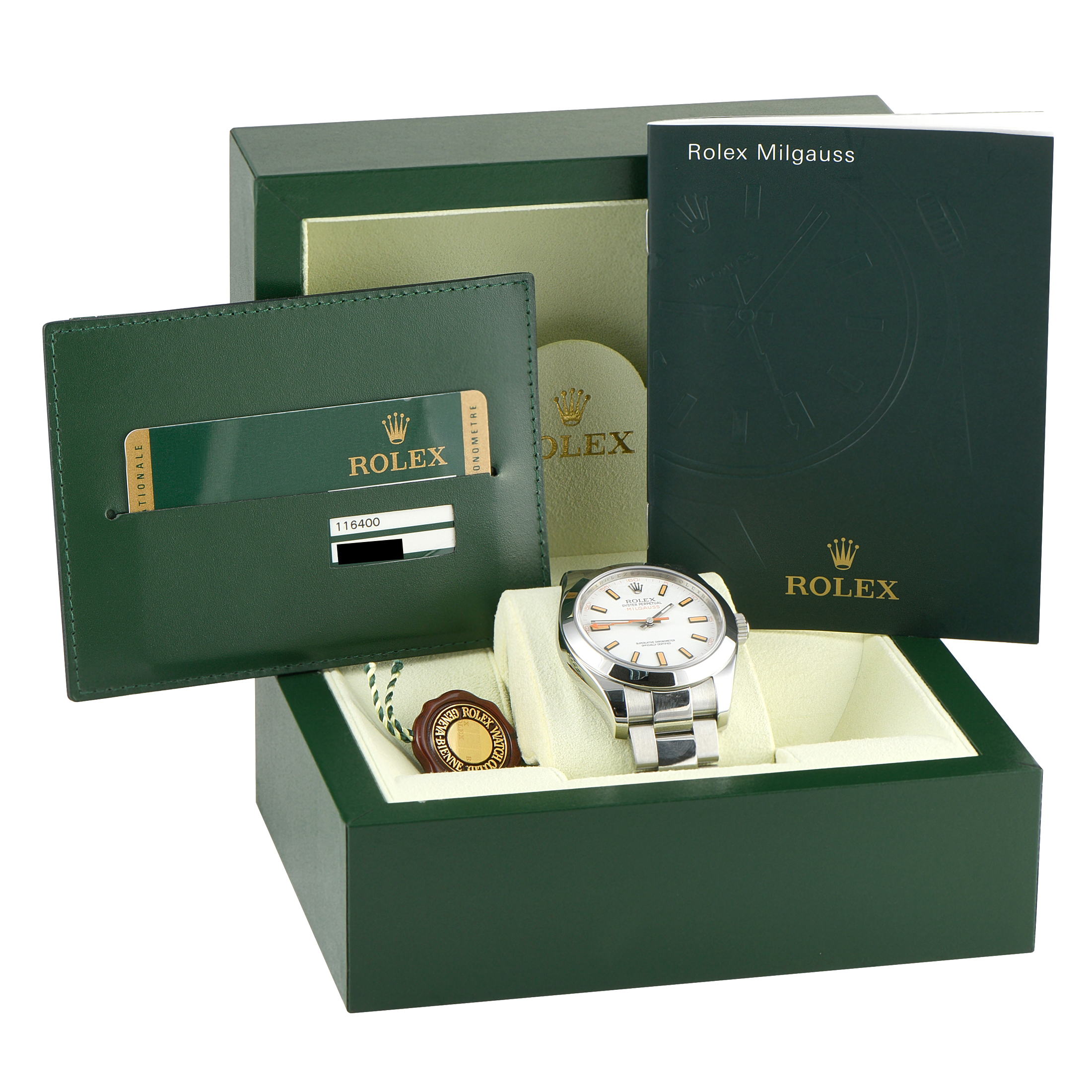 This is a pre-owned Rolex Milgauss White Dial Oystersteel Watch 116400. It is accompanied by papers and the manufacturer’s box.