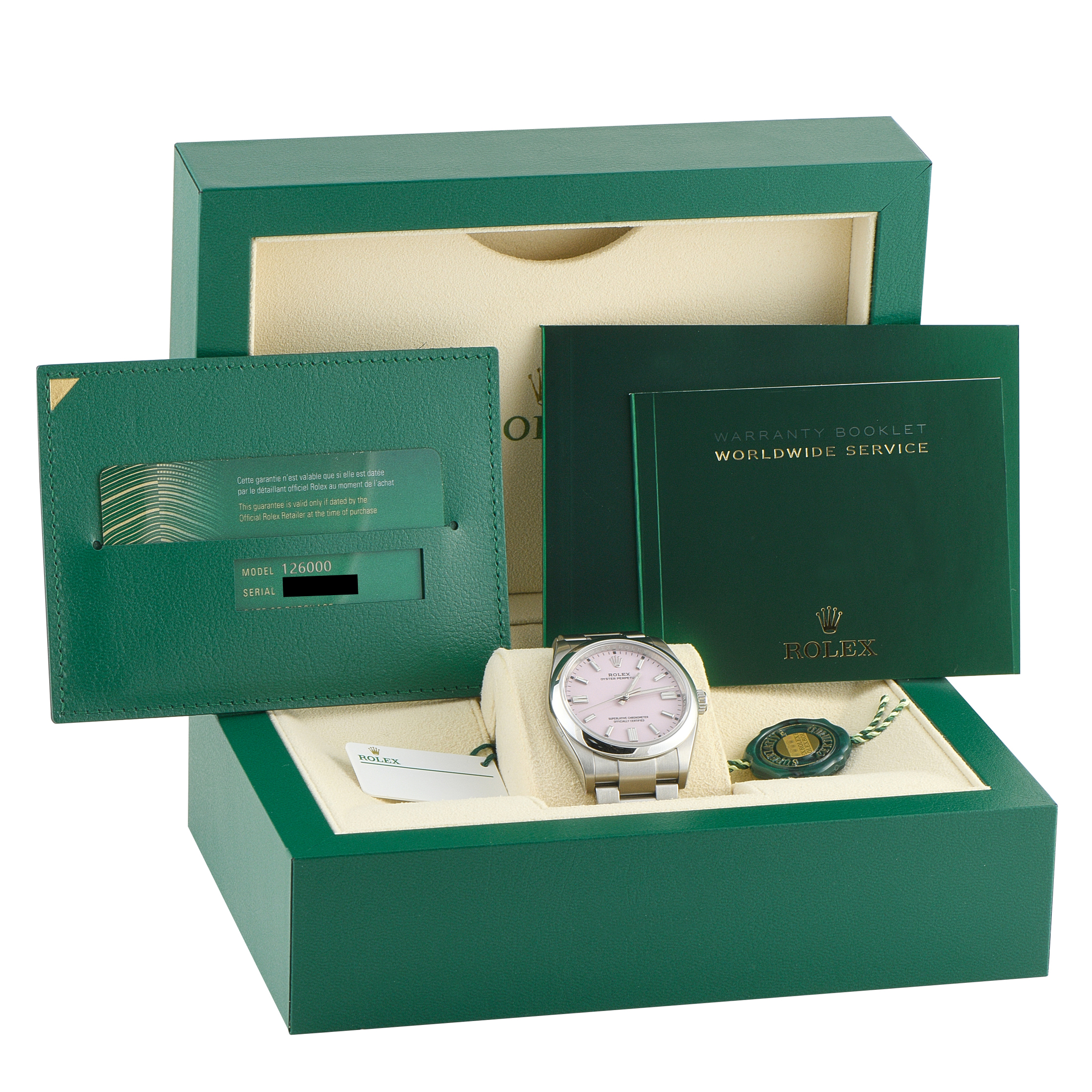 Offered pre-owned, this Rolex Oyster Perpetual 36 Candy Pink Dial Oystersteel Watch 126000-0008 is accompanied by papers and the manufacturer’s box.