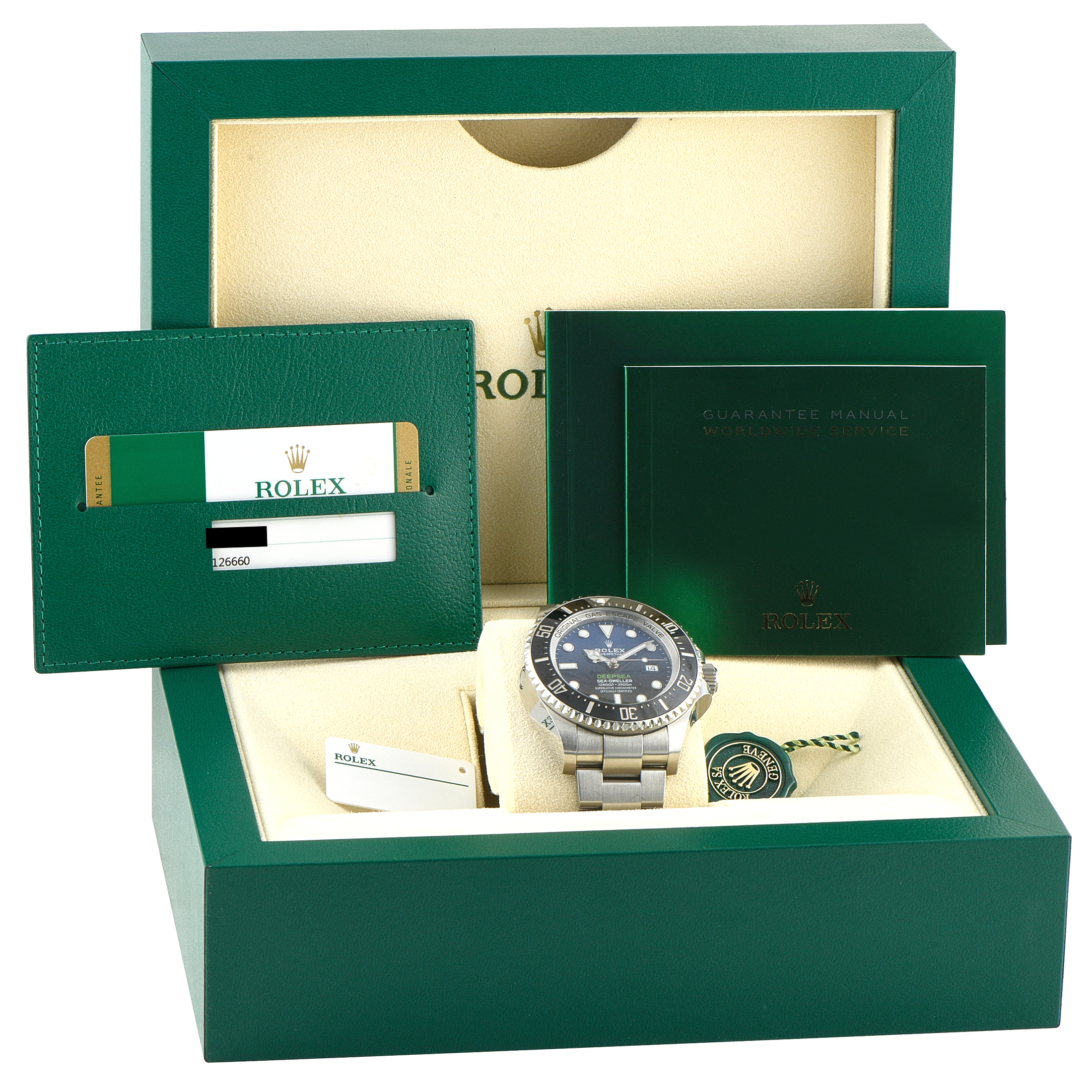 Offered pre-owned, this Rolex Sea-Dweller Deepsea D-Blue Steel Watch 126660 is accompanied by papers and the manufacturer’s box.