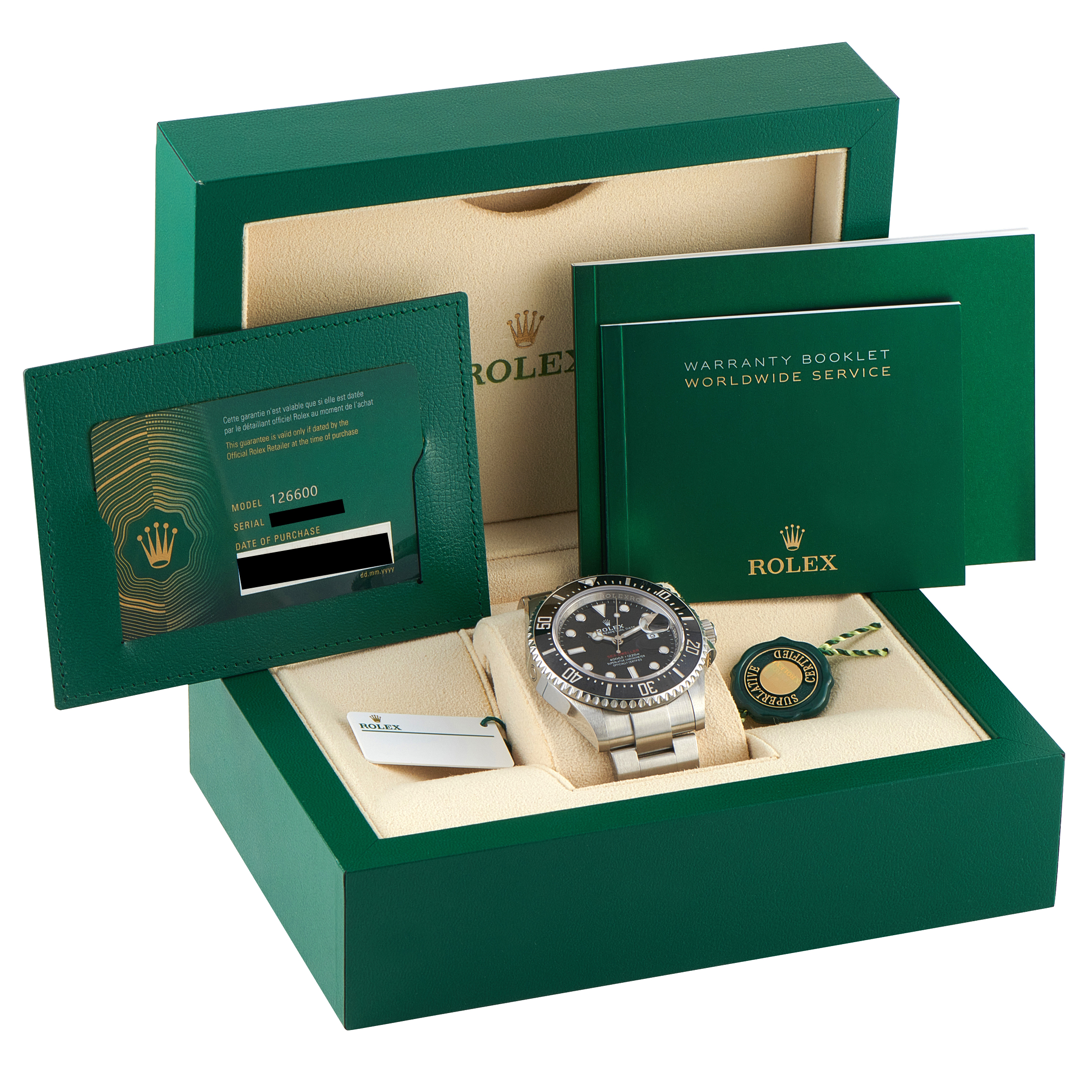 This is a pre-owned Rolex Sea-Dweller 43 Black Dial Steel Watch 126600. It comes complete with papers and the manufacturer’s box.