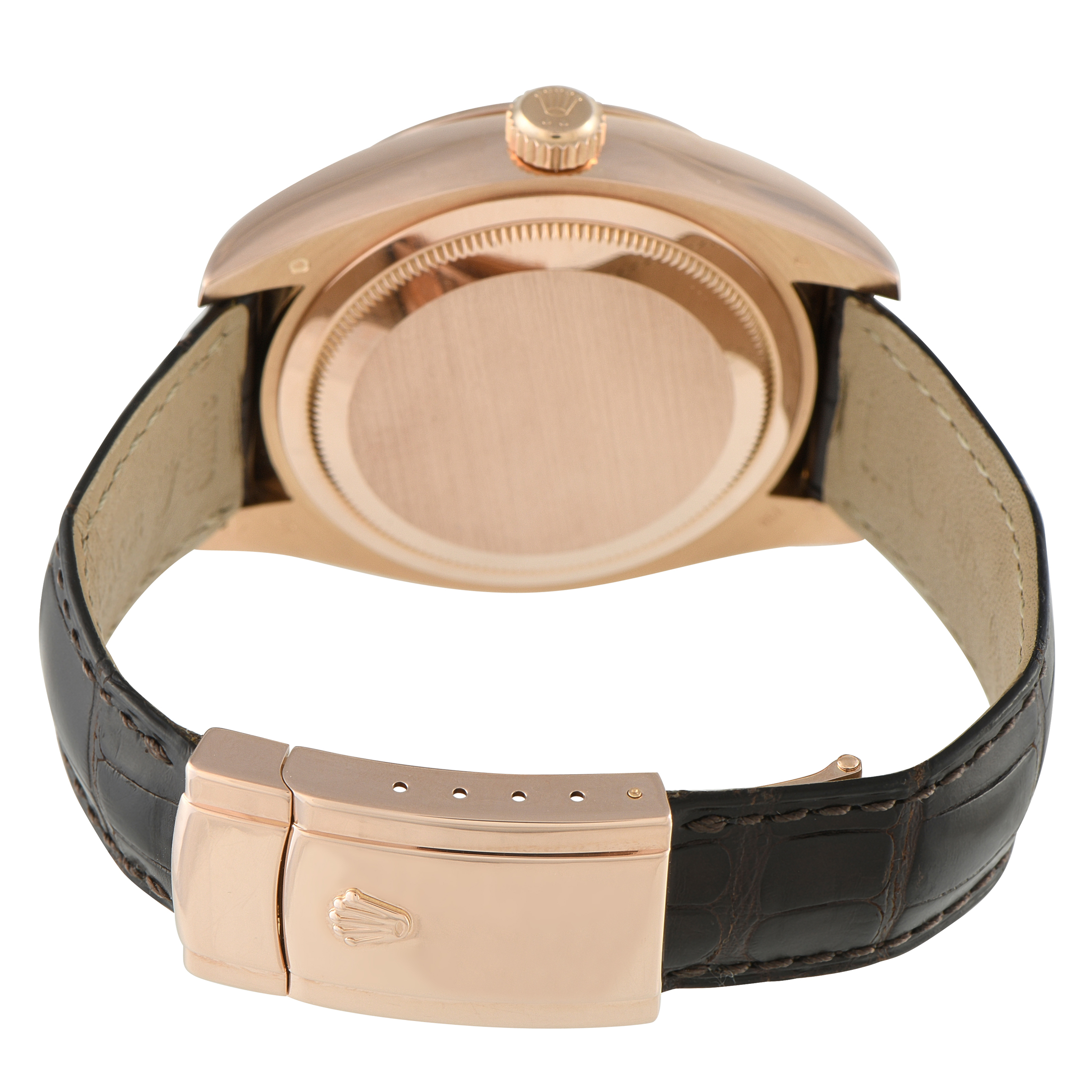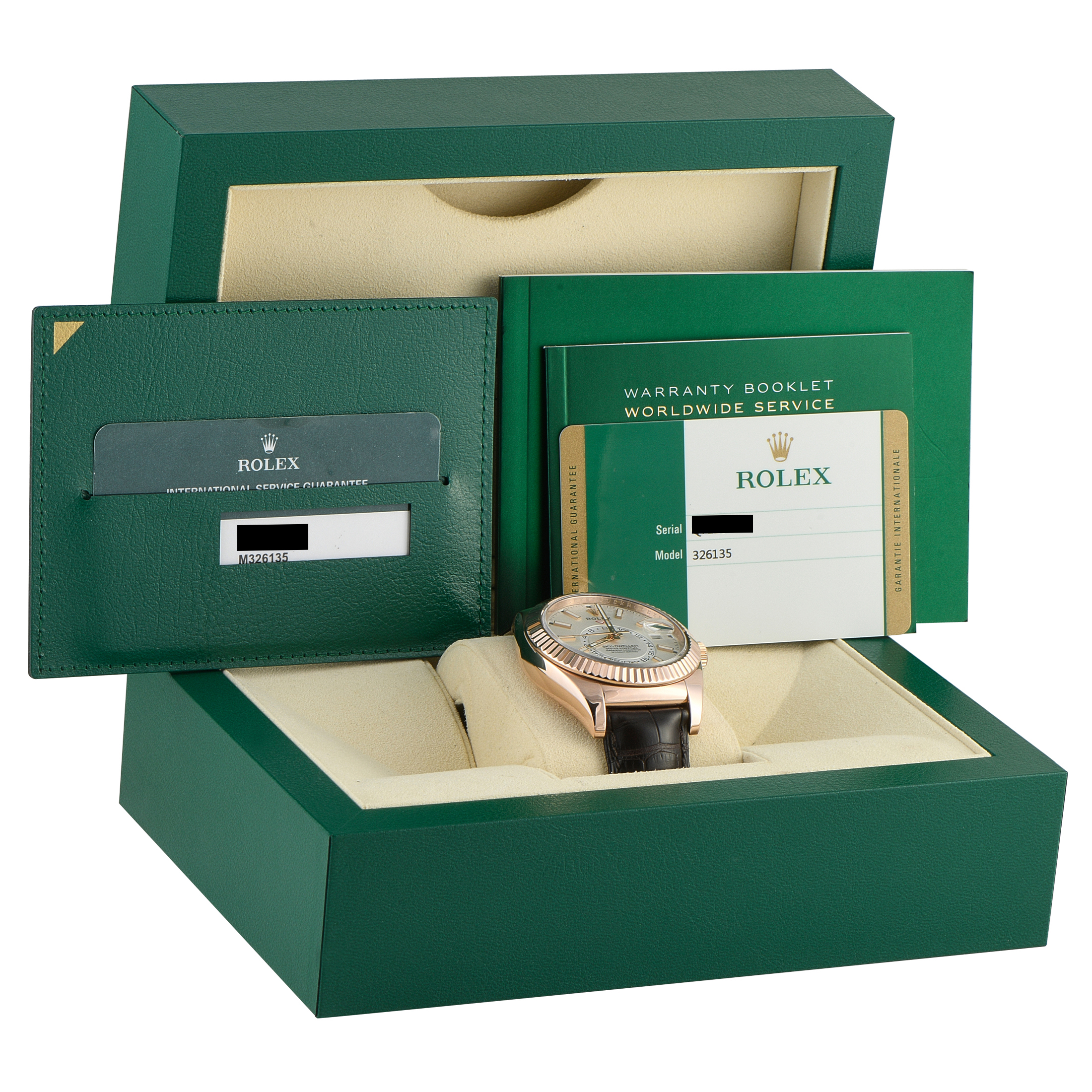 The Rolex Sky-Dweller ref. 326135-0005 makes a sophisticated companion for the modern traveler. The watch’s 42mm case is rendered in 18K Everose gold, paired with a white dial that features an annual calendar and a dual time zone display. An elegant fluted bezel frames the face, bringing subtle texture and that signature Rolex touch. Luminous hands and hour markers ensure legibility in any light, while the automatic Caliber 9001 powers the timepiece with precision and a 72-hour power reserve.