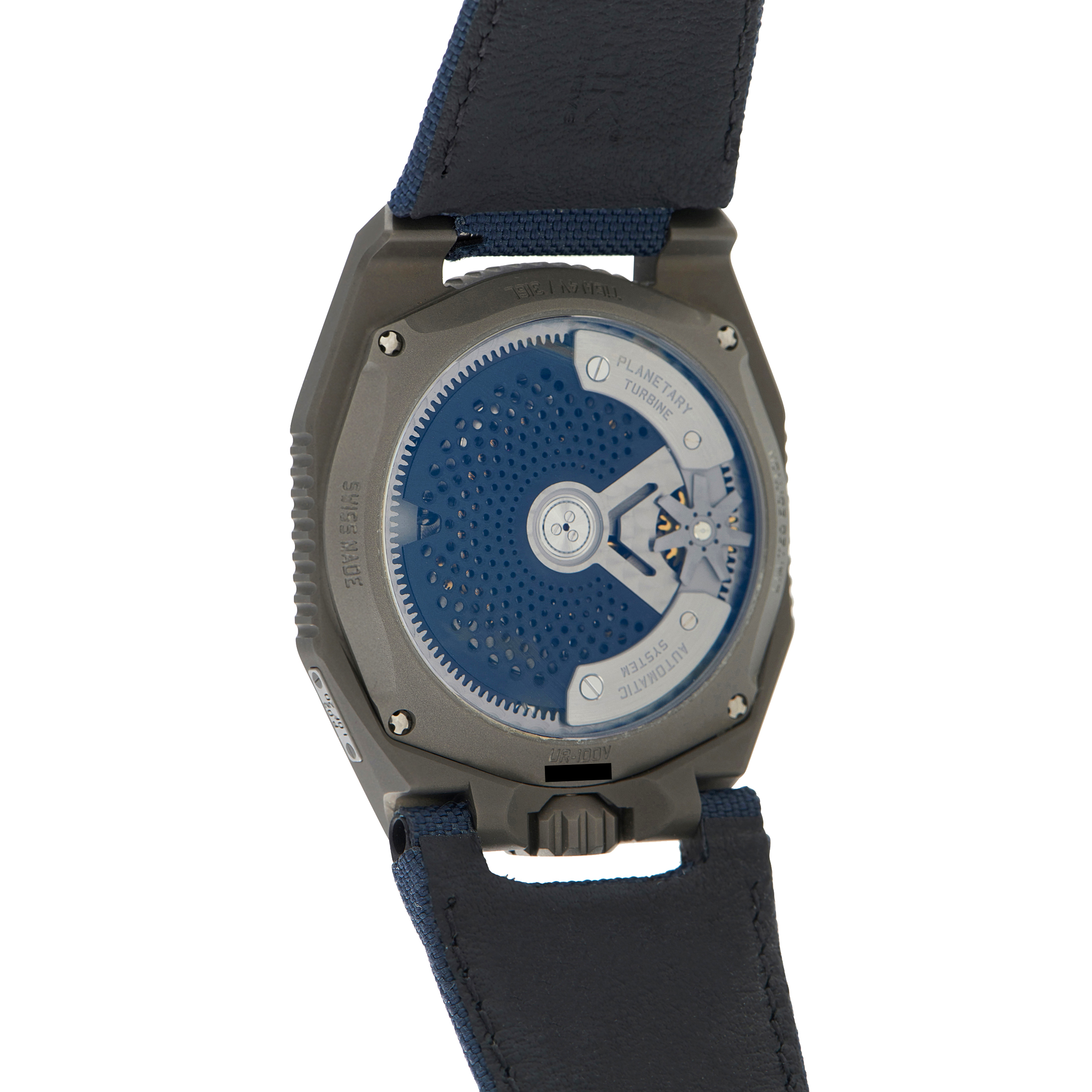 In 2022, the UR-100V made its debut, fitted with a new caliber that allowed for a redesign of the carousel for easier reading of the time. Urwerk produced several variants of the UR-100V watch including this limited edition UR-100V P.02 Limited Edition for Collective watch, released in 2021.