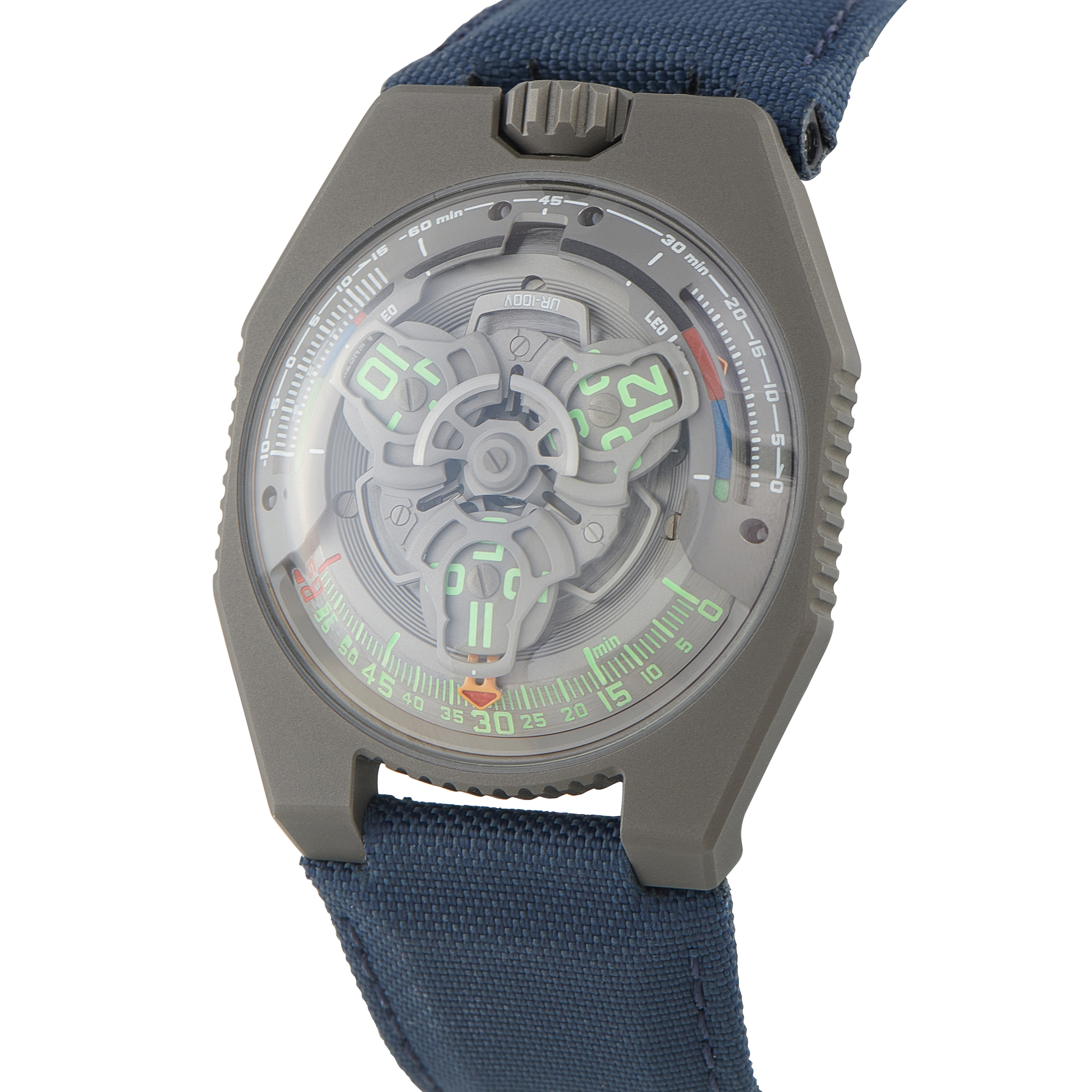 This pre-owned Urwerk UR-100 Black SpaceTime Limited Edition Watch UR-100 comes with papers and the manufacturer’s box.
